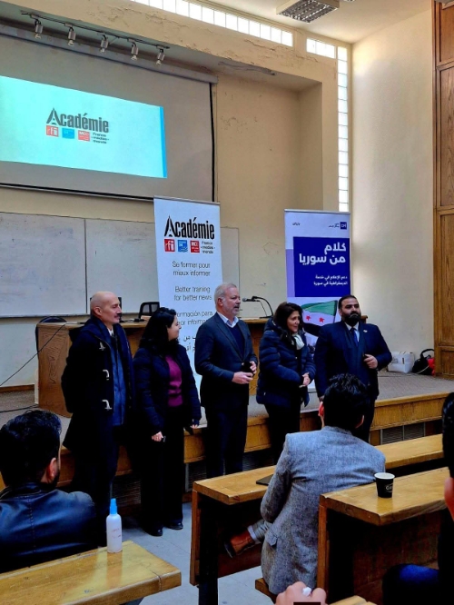 اختتمت كلية الإعلام سلسلة الدورات التدريبية التي أقامتها بالتعاون مع أكاديمية فرانس ميديا موند وامتدت على مدار أكثر من شهر، بحضور أنطوان كورموري مدير أكاديمية فرانس ميديا موند، لوران جياكوبينو وليا رينو من وكالة cfi الفرنسية. قدّمت الدورات التدريبية صوفيا عمارة صحفية ومدربة في أكاديمية فرانس ميديا موند، ودانا البوز مراسلة قناة فرانس 24 في سوريا، حيث تمحورت الدورات حول أساسيات الصحافة والتحقق من المعلومات وصناعة التقرير التلفزيوني المصور والوقوف أمام الكاميرا وصحافة الإنترنت وتقديم الأخبار على المنصات الرقمية. عميد كلية الإعلام في جامعة دمشق الدكتور خالد زعرور خلال توزيع الشهادات على الطلاب المشاركين في الدورات مع مدير أكاديمية فرانس ميديا موند أنطوان كورموري اكد على اهمية التدريب الإعلامي للطلاب وتطوير مهاراتهم العلمية وسد الفجوة بين الدراسة النظرية وسوق العمل وتأهيلهم لمواجهة تحديات الاعلام الرقمي وتعزيز المصداقية والاحترافية بما يخدم المجتمع ويواكب التطورات السريعة ويجعلهم كفاءات جاهزة للإنطلاق في مسيرتهم المهنية بكفاءة عالية . يُذكر أنّ الدورات التدريبية كانت بدعمٍ من وكالة cfi الفرنسية ضمن برنامج "كلام من سوريا".
